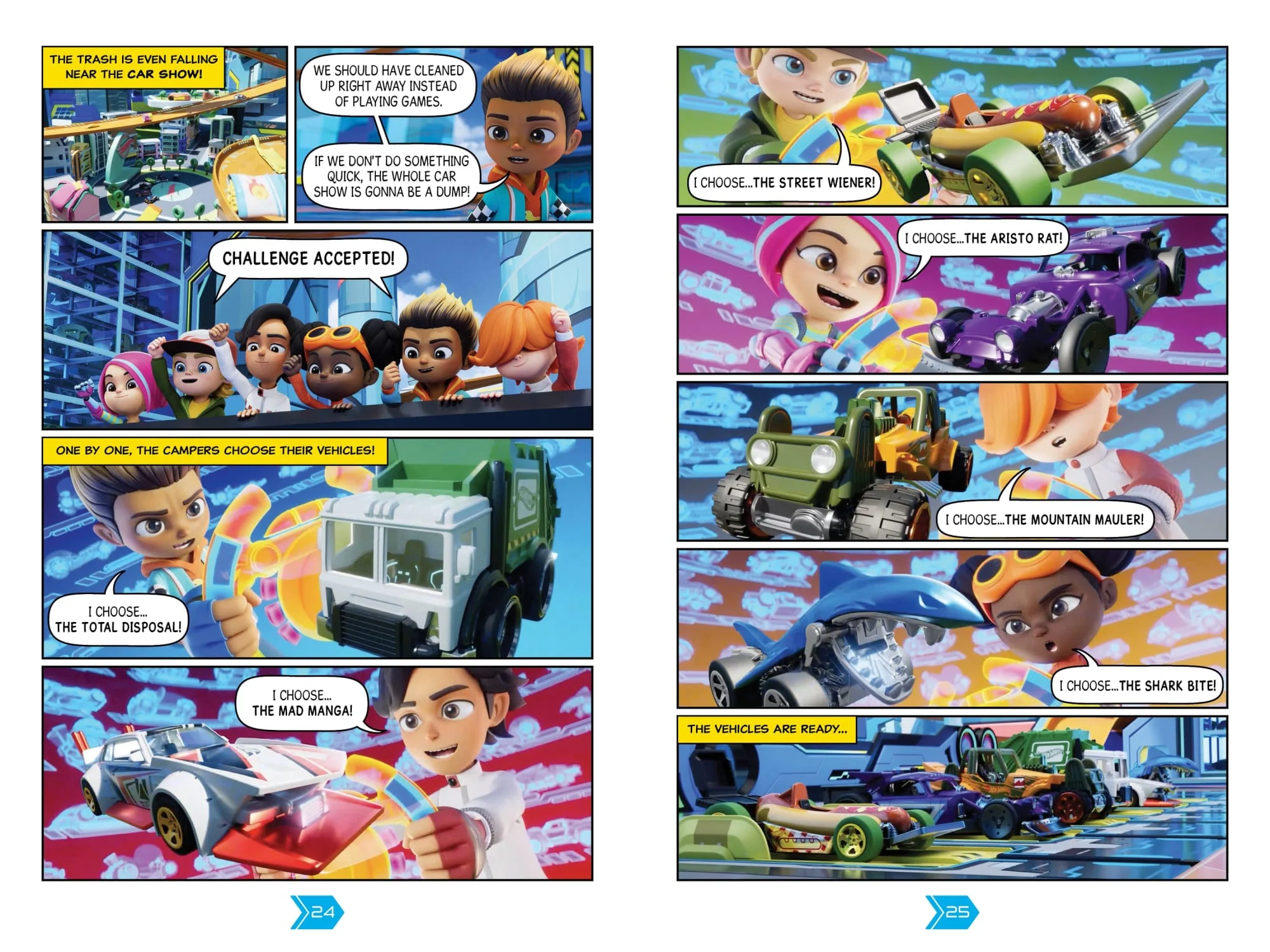 Hot Wheels Let's Race: Cleanup Challenge features two comics for young readers based on episodes from the hit Netflix kids show, 'Hot Wheels Let's Race'. In the first comic, 'Trashed Tracks,' the kids find out that procrastination can only make clean-up duty worse as their piles of trash multiply and end up all over Hot Wheels City! In the second comic, 'Mini Coop', Squeakers the robot is on clean-up duty in the Ultimate Garage and uses the Shrink-O-Tron to make the mess smaller -- unknowingly shrinking some of the racers in their Hot Wheels cars as well. Can the now tiny racers use their brainpower -- and car power -- to make themselves normal size again? Challenge Accepted!