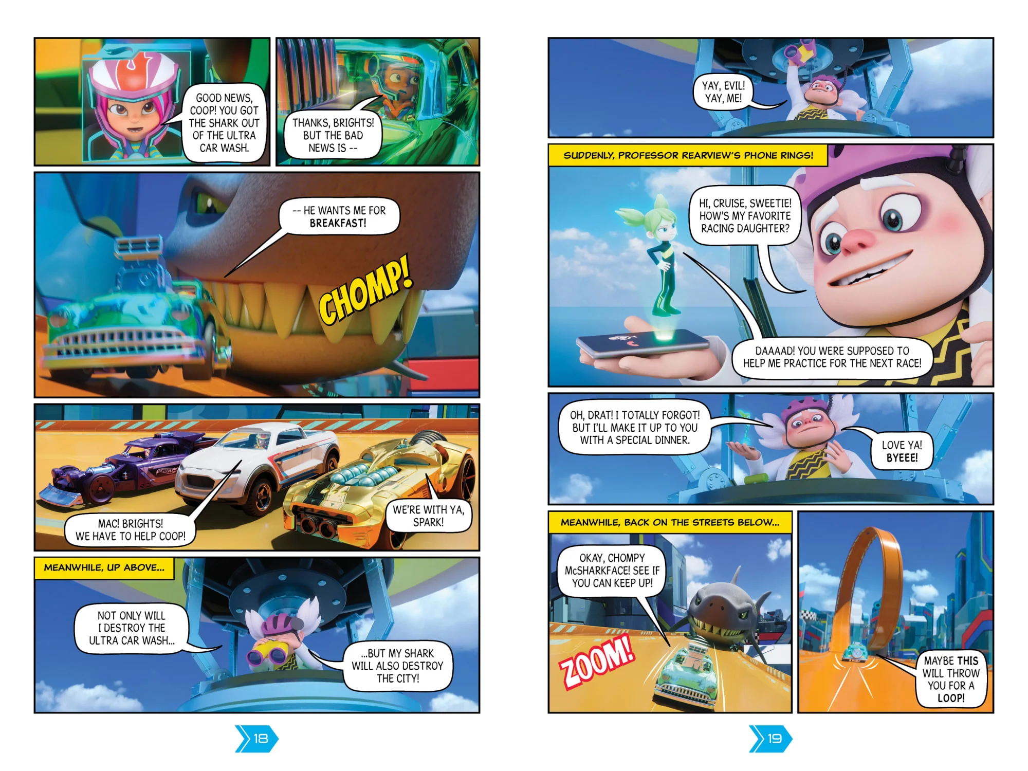 Hot Wheels Let's Race: Racers to the Rescue features two comics for young readers based on episodes from the hit Netflix kids show, 'Hot Wheels Let's Race'. In the first comic, 'Jumping the Shark,' there's a giant shark on the loose in Hot Wheels City, taking chomps out of everything it can sink its big teeth into. In the second comic, 'Squeakers on the Fritz', Squeakers the robot is sick and when Brights tries to make him better, she makes things way worse. Join kid racers Coop, Axle, Brights, Spark, Sidecar, and Mac -- and their chosen Hot Wheels cars -- as they race to save Hot Wheels City!